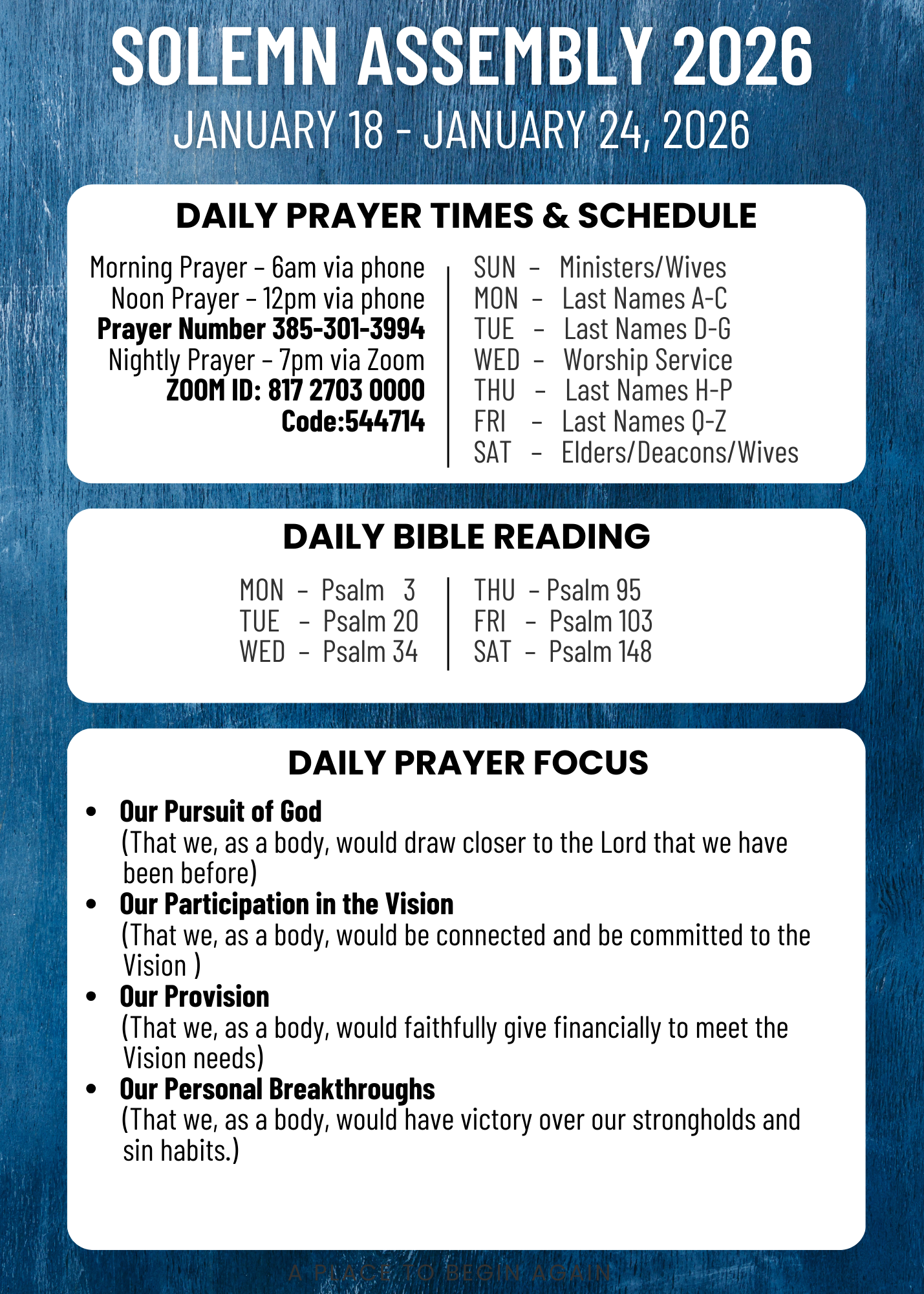 Therefore, in a Christ like fashion, we desire to be a place where people of all races, ethnicities, educational levels, financial categories, and life issues can experience the healing balm of blessing through this ministry in order to Begin Again.